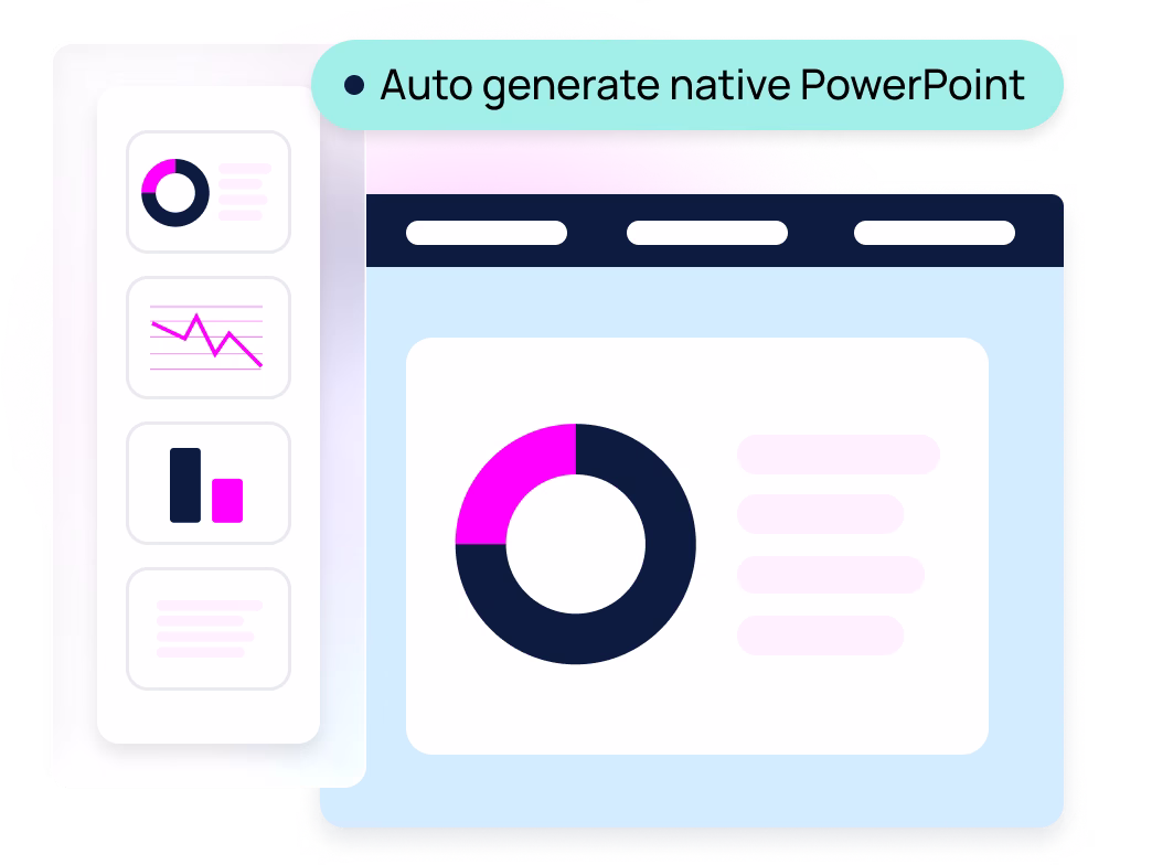 Build native PowerPoint decks and online dashboards that auto-refresh with new data.