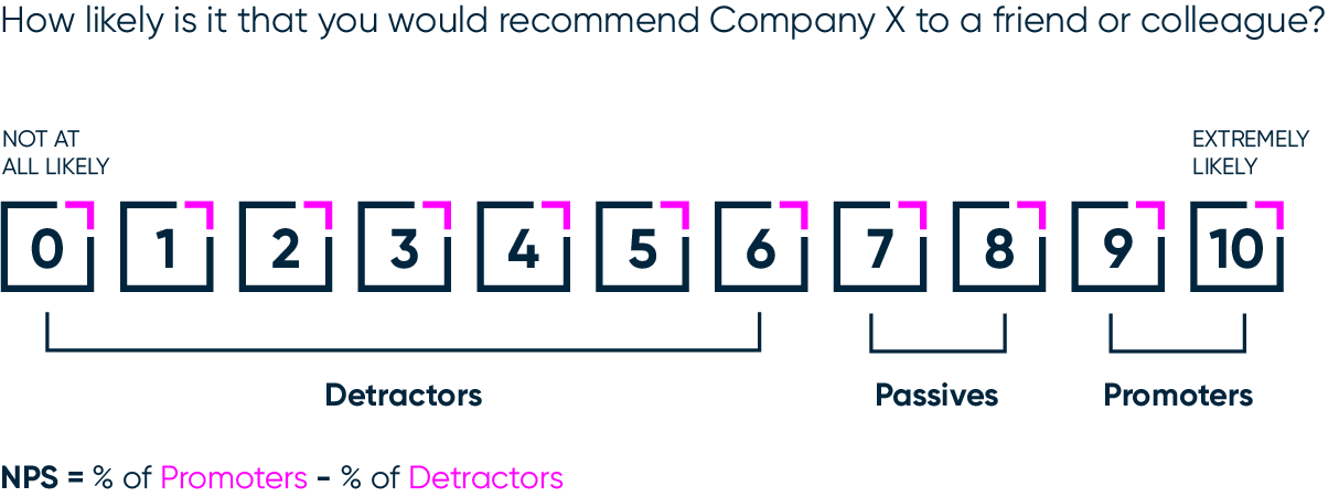 So how is the Net Promoter Score calculated? NPS is based on the answer to one question: How likely are you to recommend Company/Product/Service X to a friend or colleague? Following the Net Promoter Score methodology, the scale used for this question is an 11-point scale, ranging from 0-10. Below is the formula to calculate your NPS rating.